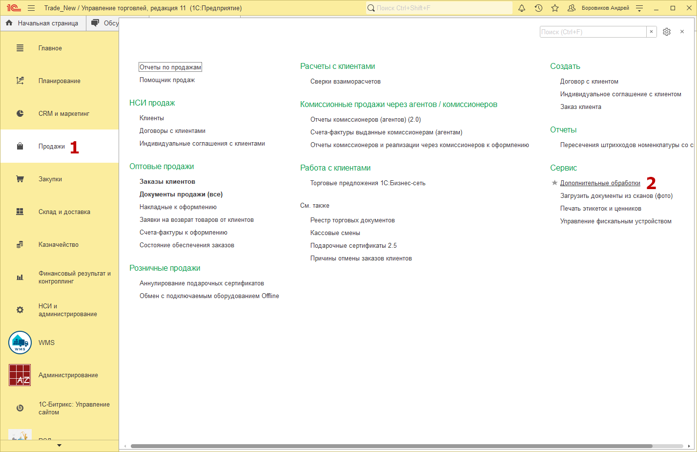 Переходим в раздел Продажи – Сервис – Дополнительные обработки
