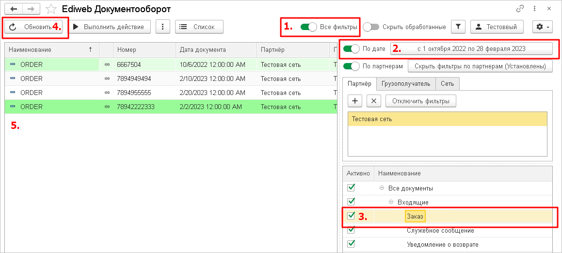 -В окне со списком документов появятся заказы, которые были отправлены от контрагентов, отображаются на платформе Ediweb, а также имеют технический статус «Не прочитан».