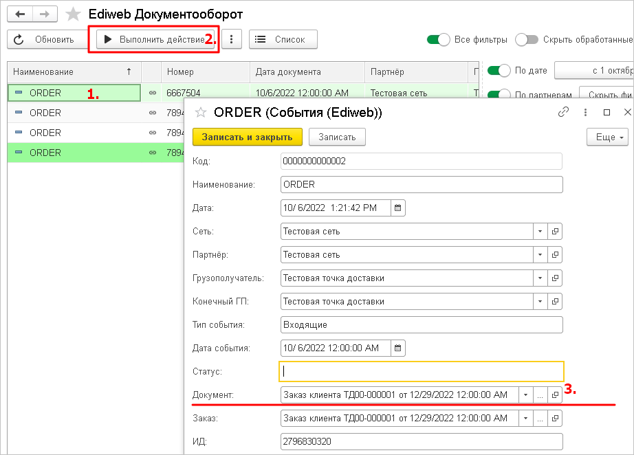 Для создания документов в учётной системе выберите документ, который требуется загрузить (возможен выбор нескольких документов, для этого необходимо зажмите кнопку Shift, либо Ctrl и выберите документы) (1). Затем нажмите кнопку «Выполнить действие» (2). В 1С создастся документ (в зависимости от настроек модуля может быть: Заказ, Реализация и т. д.).