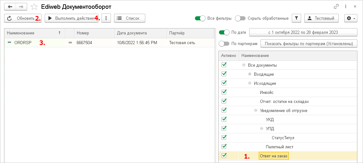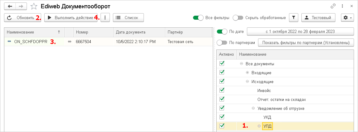-«Обновить» – служит для обновления динамического списка документов. Для входящих документов идёт их загрузка с платформы Ediweb, для исходящих – чтение справочников 1С. Результатом обновления будет заполнение списка документов, который соответствует выставленным параметрам: типы документов, временной период и партнёр.