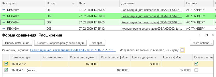 Кнопка «Внести изменения» внесёт изменения согласно RECADV в документ «Реализация» в 1С.