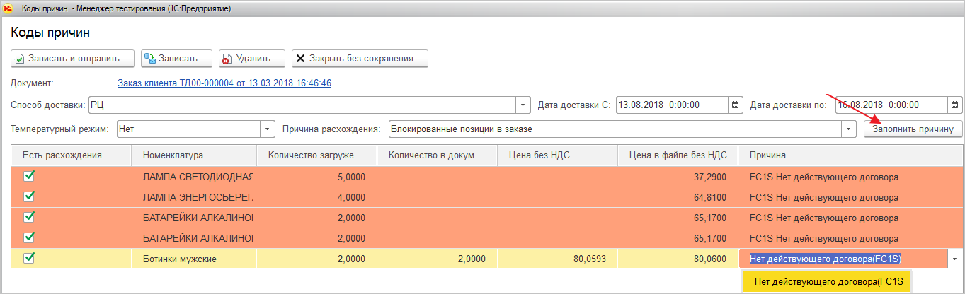 В каждой строке укажите причину из списка или выставьте одну, нажав кнопку «Заполнить причину»