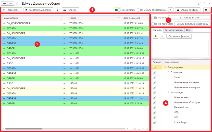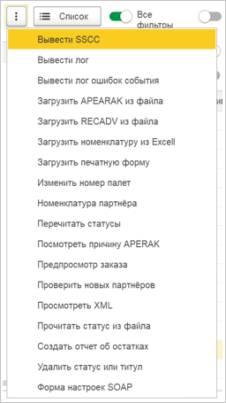 -Все фильтры» – позволяет вывести в динамический список все документы без фильтрации по партнёрам и датам и независимо от статуса обработки.