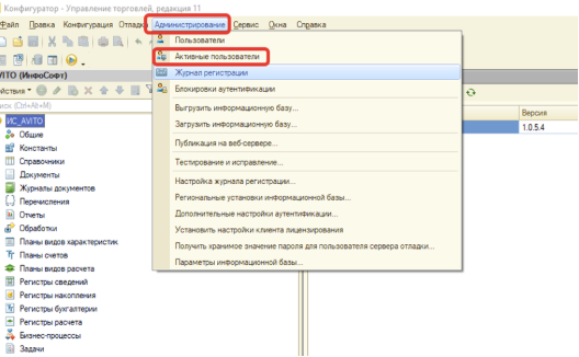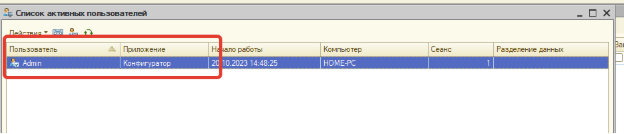 1. Убедиться, что все пользователи вышли из базы. Зайти в пункт «Администрирование» – «Активные пользователи» и убедиться, что в списке активных пользователей указан только один пользователь, находящийся в приложении «Конфигуратор»: