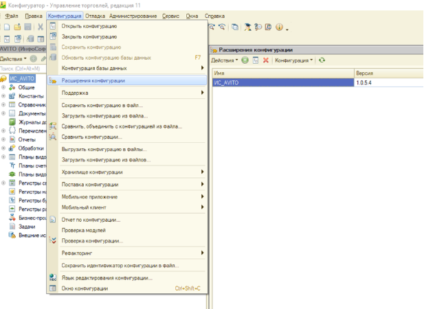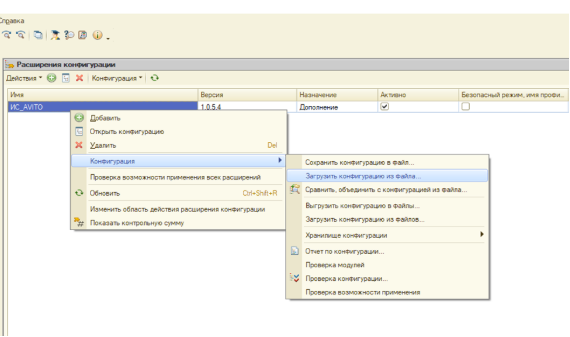 3. Щелкнуть правой кнопкой мыши по расширению с именем ИС_AVITO и в выпавшем меню выбрать пункт «Конфигурация» – «Загрузить конфигурацию» из файла:
