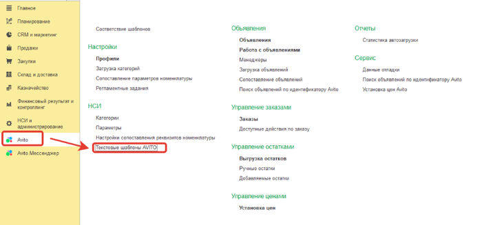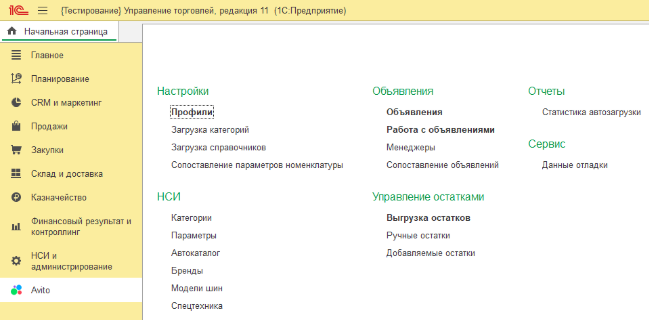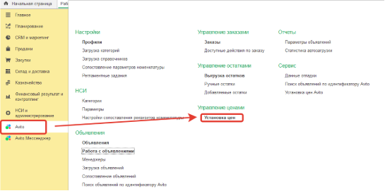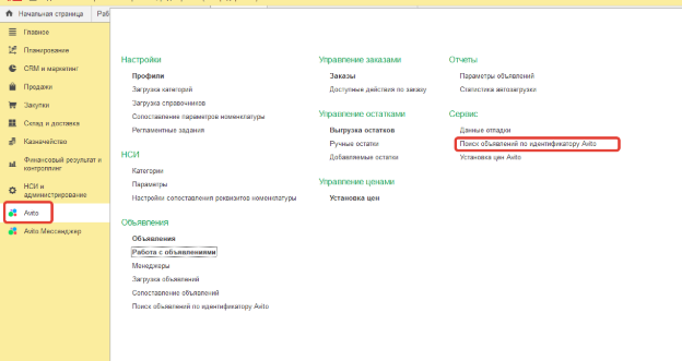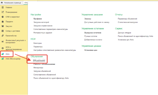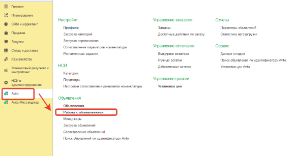После установки расширения «Авито» в панели разделов появиться новый раздел «Avito», его состав имеет следующий вид: