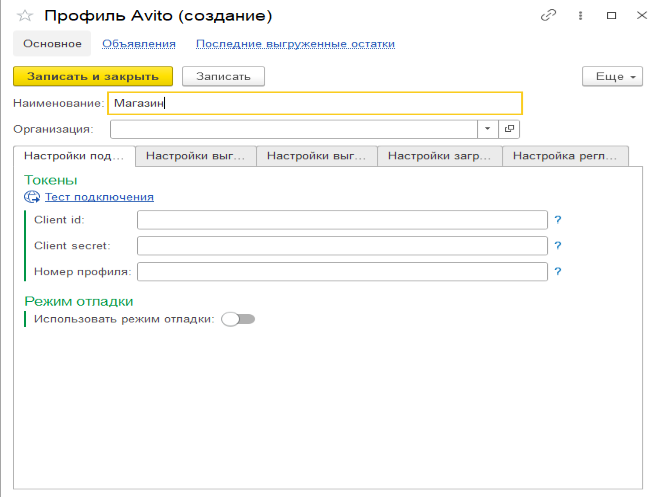Также на данной вкладки можно включить режим отладки. Данный функционал может помочь при выявлении ошибок при запросах к API Avito.