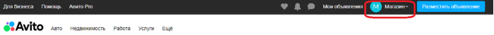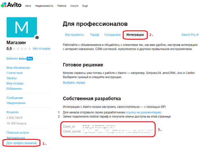 Поля «Client id» и «Client secret» необходимо заполнить в соответствии со значениями в вашем личном кабинете авито, они предназначены для работы с API Avito. Для их заполнения необходим воспользоваться следующей ссылкой https://www.avito.ru/professionals/api, либо перейдя на главную страницу сайта Авито https://avito.ru нажать на название вашего магазина (если вместо него отображается надпись «Вход и регистрация» то предварительно надо пройти авторизацию)
