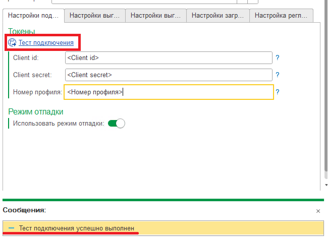 После заполнения данных необходимо нажать на ссылку «Тест подключения», если все сделано верно, то будет выведено сообщение об успешной проверке. Форма примет следующий вид: