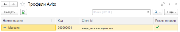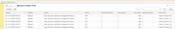 После включения данного режима в специальный регистр, находящийся в разделе «Сервис» - «Данные отладки» будут производится записи всех запросов к API Avito по данному личному кабинету, содержащие все необходимые данные для технической поддержки:
