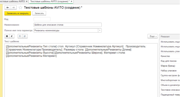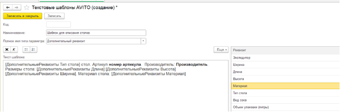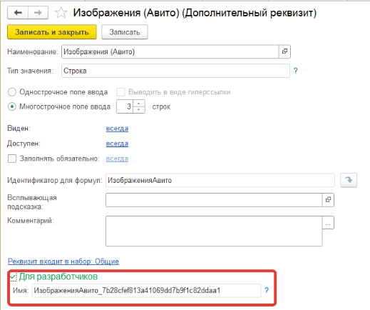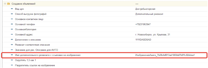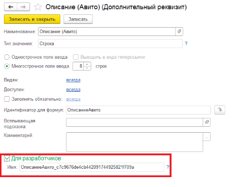 Если выбрано описание из дополнительного реквизита, тогда необходимо в поле «Значение доп. рек. Описание для AVITO» указать имя (для разработчика!) данного реквизита. Найти его можно в описании доп. реквизита: