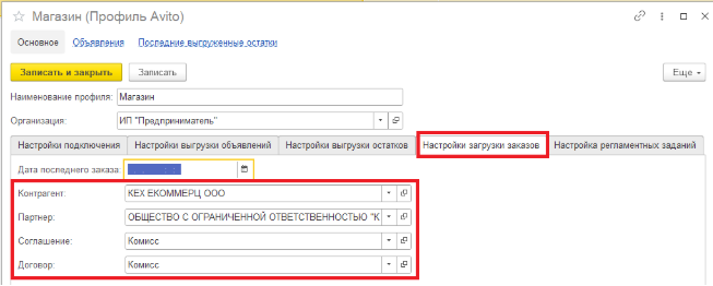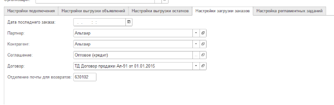 Для того чтобы начать работу с заказами необходимо в настройках профиля заполнить информацию о Контрагенте, Партнере, Соглашении и Договоре во вкладке “Настройки загрузки заказов”, данные реквизиты в дальнейшем будут подставляться в документ “Заказ клиента”