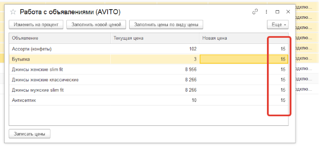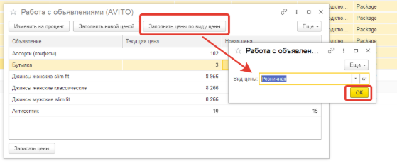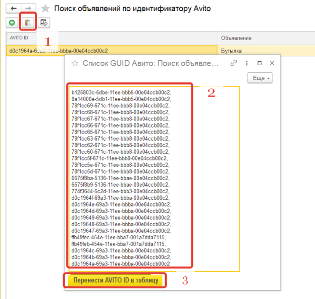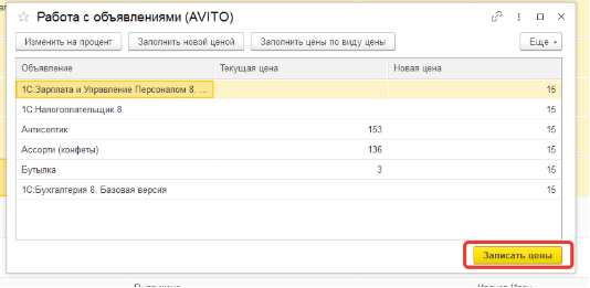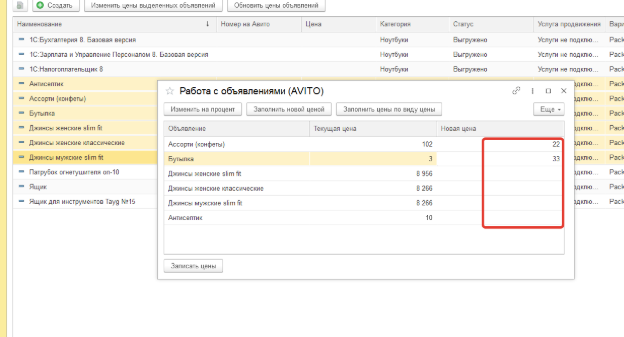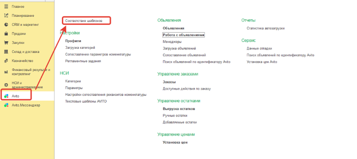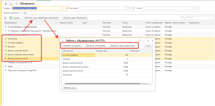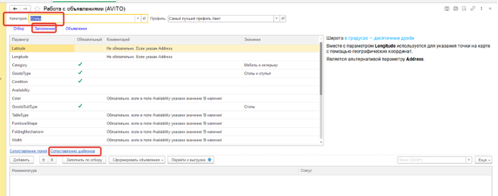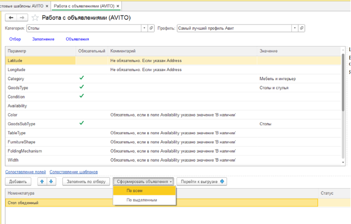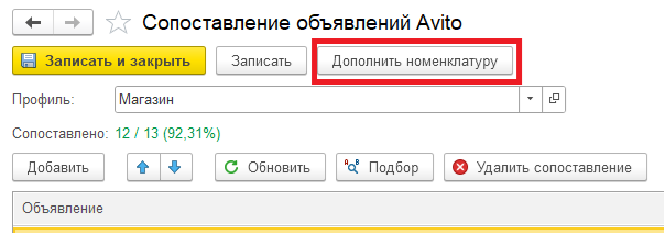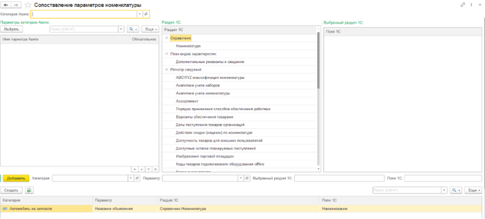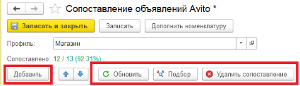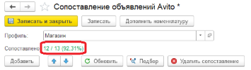 • Сопоставление объявлений Avito с номенклатурой 1С по наименованию (с возможностью сопоставления нескольких позиций номенклатуры для одного объявления)
