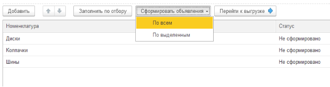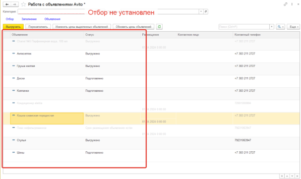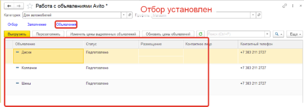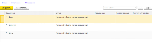 Обработка по выгрузки объявлений состоит из следующих колонок:
