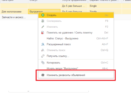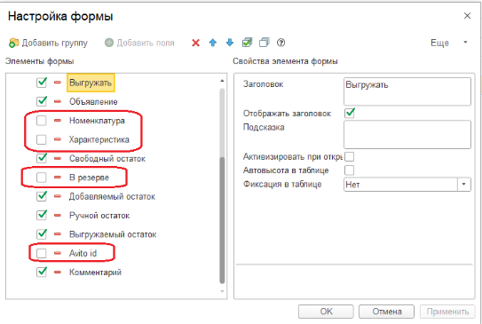 При необходимости в данной обработке можно отобразить дополнительные столбцы: «Номенклатура», «Характеристика», остаток «В резерве» и «Avito id». Данный функционал реализован при помощи стандартного меню «Изменить форму» платформы 1С: Предприятие