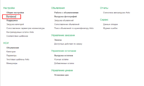 Чтобы начать работу в модуле необходимо создать «Профиль Avito» для этого необходимо перейти в раздел «Настройки» -> «Профили».