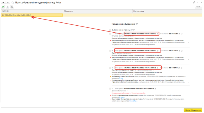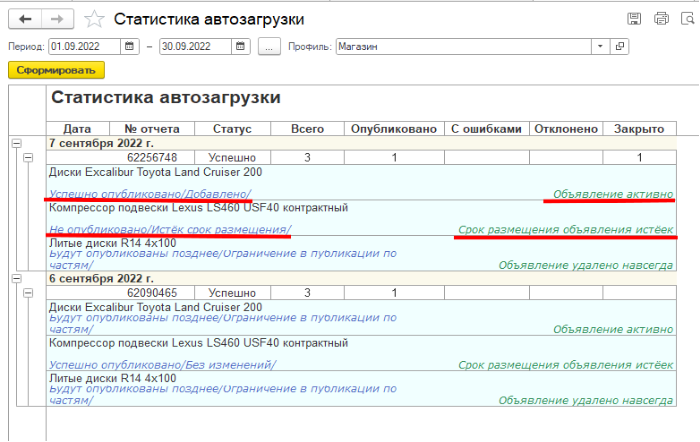 В отчете группировка происходит по дате выгрузки и номеру отчетов. В отчете можно увидеть состояние и статус объявления, есть ли ошибки при публикации.