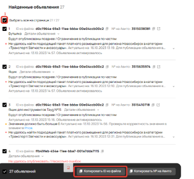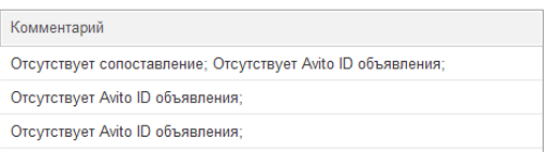 Если во время выгрузки происходили ошибки, то информация о них буду отображена в столбце комментарий по каждому конкретному объявлению.