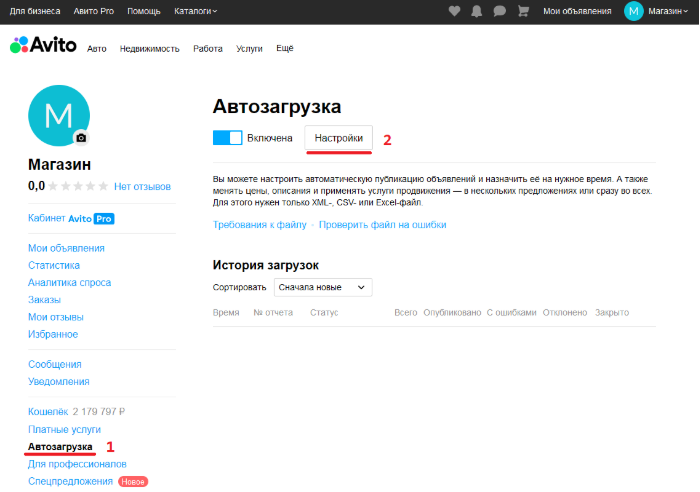 Для того чтобы загрузить перечень объявлений созданных на Авито в 1С необходимо перейти в личный кабинет в раздел «Автозагрузка» и нажать кнопку «Настройки»: