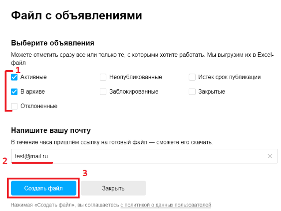 Далее необходимо выбрать перечень объявлений, которые вам необходимо загрузить и вписать почту на которую будет отправлен файл выгрузки и нажать кнопку «Создать файл»:
