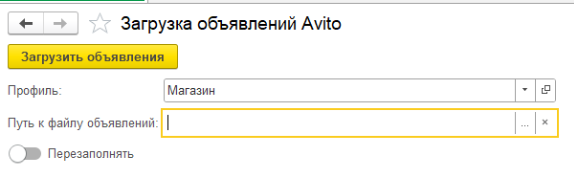 В открывшейся форме необходимо выбрать профиль к которому относятся выгруженные объявления и выбрать загруженный файл в поле «Путь к файлу объявлений», далее нажать кнопку «Загрузить объявления», если файл загружается повторно и необходимо обновить информацию в уже созданных объявлениях, то необходимо установить переключатель «Перезаполнять»: