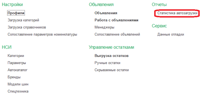 Для получения отчета по автозагрузке открываем раздел «Avito» и выбираем «Статистика автозагрузки» в группе «Отчеты»