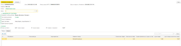 Документ заказ содержит в себе информацию о товаре, суммам, датам действий и информации о доставке: