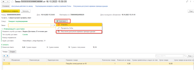 Для типа доставки rDBS доступны дополнительные действия подтверждение отправки заказа (Подтвердить отправку), подтверждение доставки заказа (Подтвердить доставку) и передача стоимости и сроков доставки курьером продавца (Передать условия доставки).