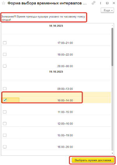 Если менеджер работает по часовому поясу, отличному от часового пояса склада, будет показано предупреждение. Временные интервалы отображаются по часовому поясу склада.