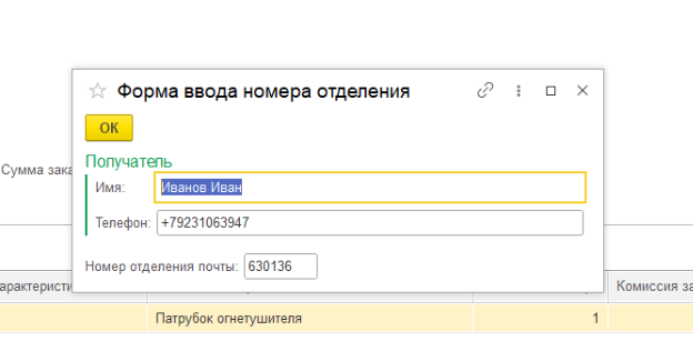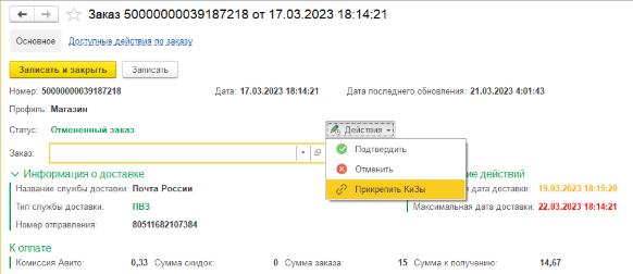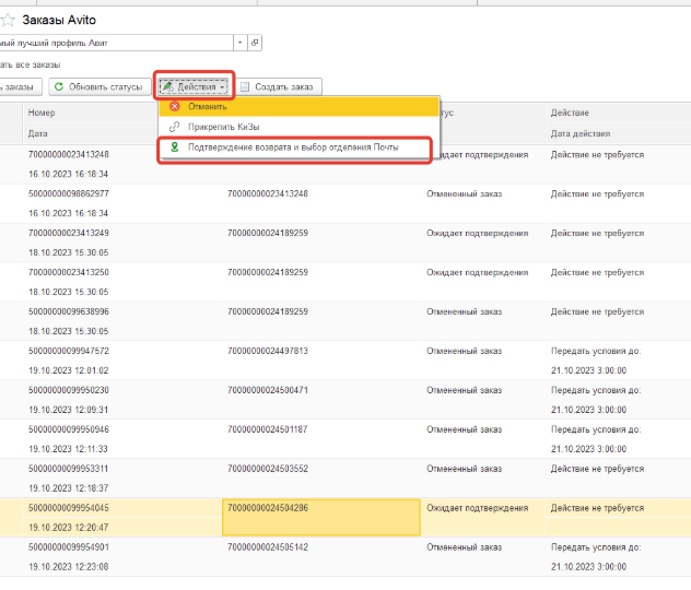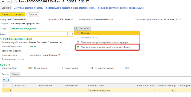 Для заказов с указанным статусом реализован функционал подтверждения возврата заказа с возможностью указания отделения Почты России. Для этого добавлена команда «Подтверждение возврата и выбор отделения Почты». Команду можно вызвать в форме списка или документа заказа: