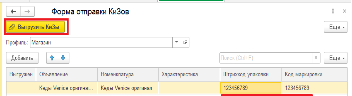 Если по товару требуется передачи маркировки Честного Знака, необходимо нажать кнопку «Прикрепить КиЗы»: