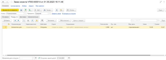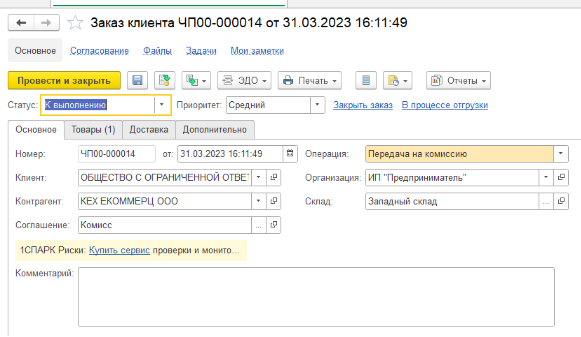 После чего по выбранным заказам будет создан документ “Заказ клиента”, содержащий всю необходимую информацию для дальнейшего процесса отгрузки и создания реализаций: