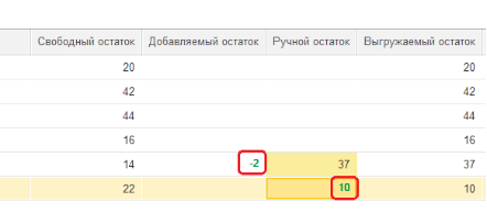 Также данными остатками можно управлять прямо из обработки устанавливая необходимые значения в соответствующих колонках, измененные значения будут выделяться зеленым цветом
