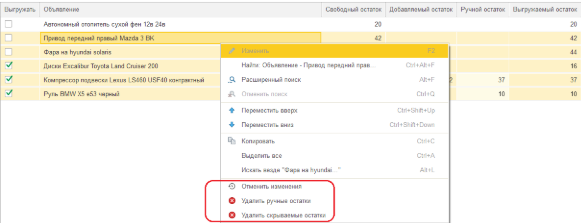 Также доступны команды для отмены изменений и удаления записей о ручных и добавляемых остатках, доступны при нажатии на список правой кнопкой мыши и применяются ко всем выделенным строкам.