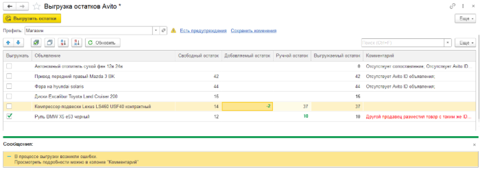 • Проверка корректности заполнения объявлений перед выгрузкой остатков с описанием ошибок