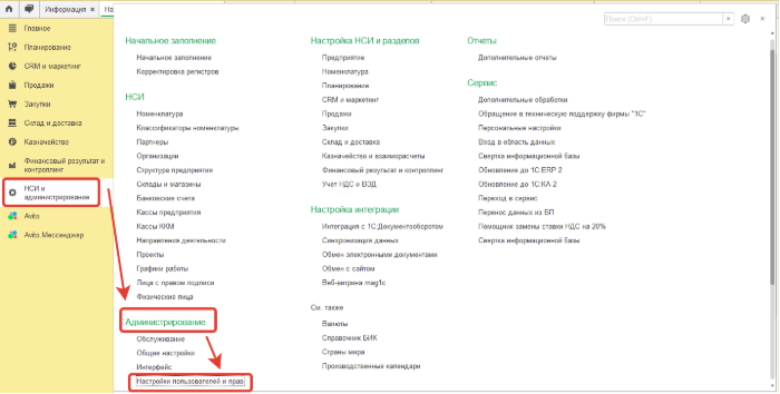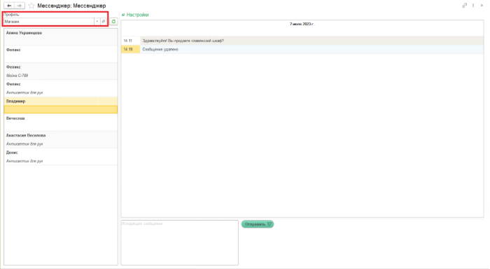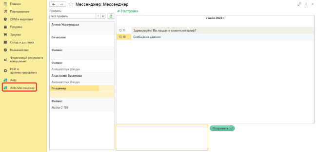 Данная подсистема доступна для пользователей с полными правами и для пользователей с ограниченными правами, но установленной ролью «Работа с мессенджером(AVITO)».