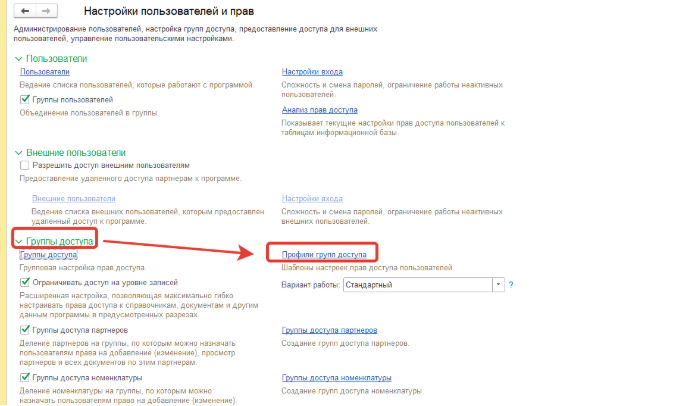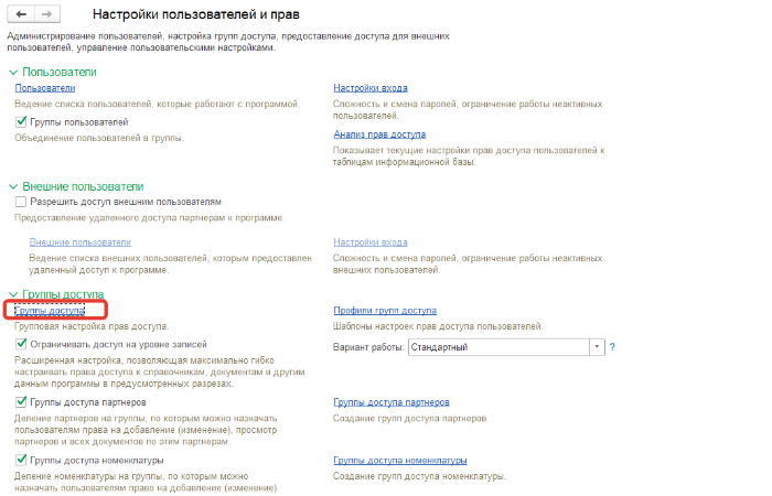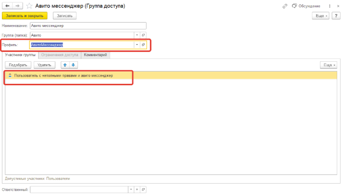 И в ней, в качестве Профиля, указать только что созданный Профиль группы доступа. В табличную часть Участники группы можно добавить пользователей с ограниченными правами, которым необходимо разрешить доступ к мессенджеру.