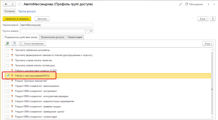 Чтобы дать пользователю доступ к роли «Работа с мессенджером(AVITO)», необходимо создать Профиль групп доступа и добавить в него указанную роль: