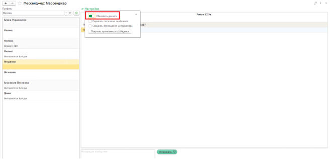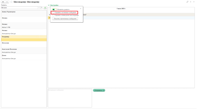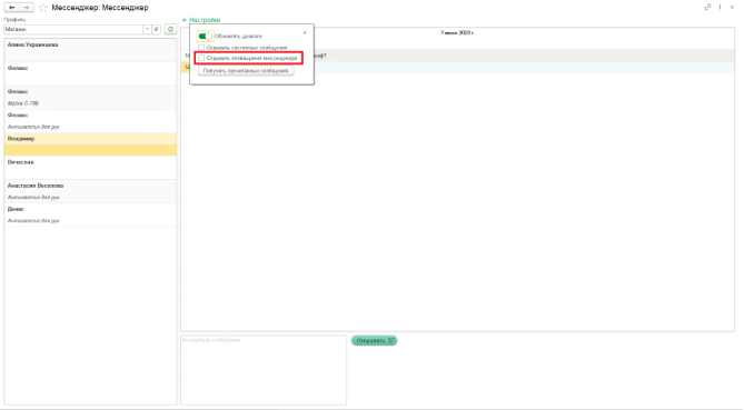 Для отключения оповещений получения новых сообщений пользователь может установить чекбокс «Скрывать оповещения мессенджера»: