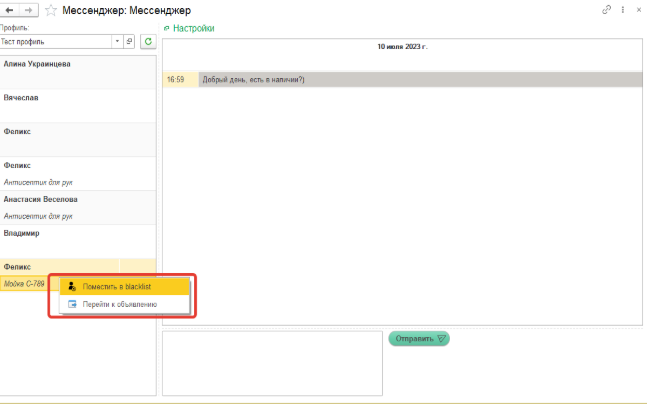 Если диалог с покупателем происходит в контексте Объявления, в него можно перейти, воспользовавшись командой контекстного меню (вызывается нажатием правой кнопкой мыши на диалоге):