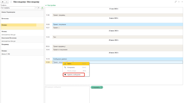 Также есть возможность удаления исходящих сообщений, команда удаления сообщения вызывается по команде контекстного меню «Удалить сообщение»: