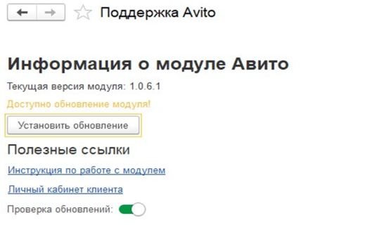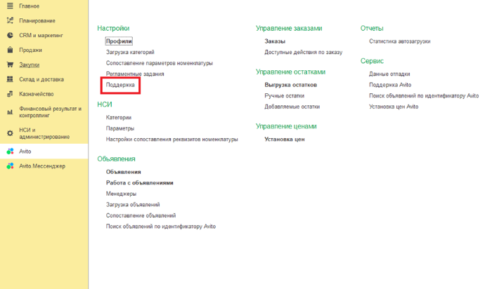 Модуль Авито можно обновлять в автоматическом режиме. Для этого необходимо перейти в раздел «Настройки» и открыть вкладку «Поддержка».