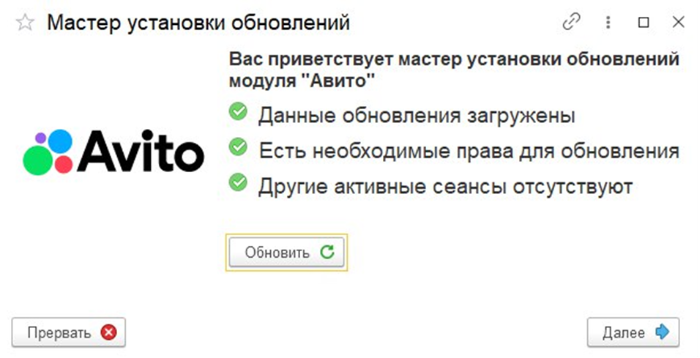 При нажатии на кнопку «Установить обновление» открывается мастер настройки обновления. Перед началом установки проверяется загрузка необходимых данных о релизе, проверяются права, необходимые для установки обновления и наличие других активных сеансов. При выполнении всех указанных пунктов можно перейти в следующую вкладку.