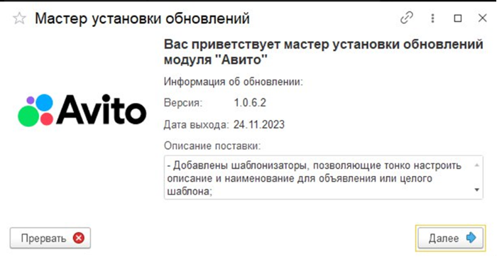 В следующем окне находится информация об обновлении модуля: версия, дата выхода и описание поставки (новое в релизе):