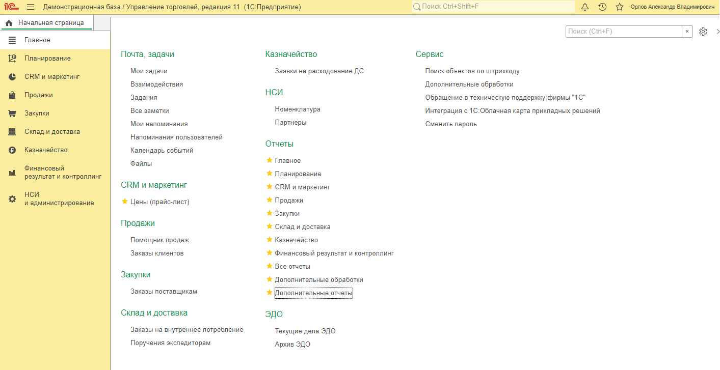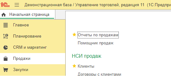 Все доступные отчёты в программе можно увидеть в разделе «Главное», подменю «Отчёты». Здесь отчёты сгруппированы по разделам: «Главное», «CRM и маркетинг», «Продажи», «Закупки», «Склад и доставка» и т. д. (рис. 1).
