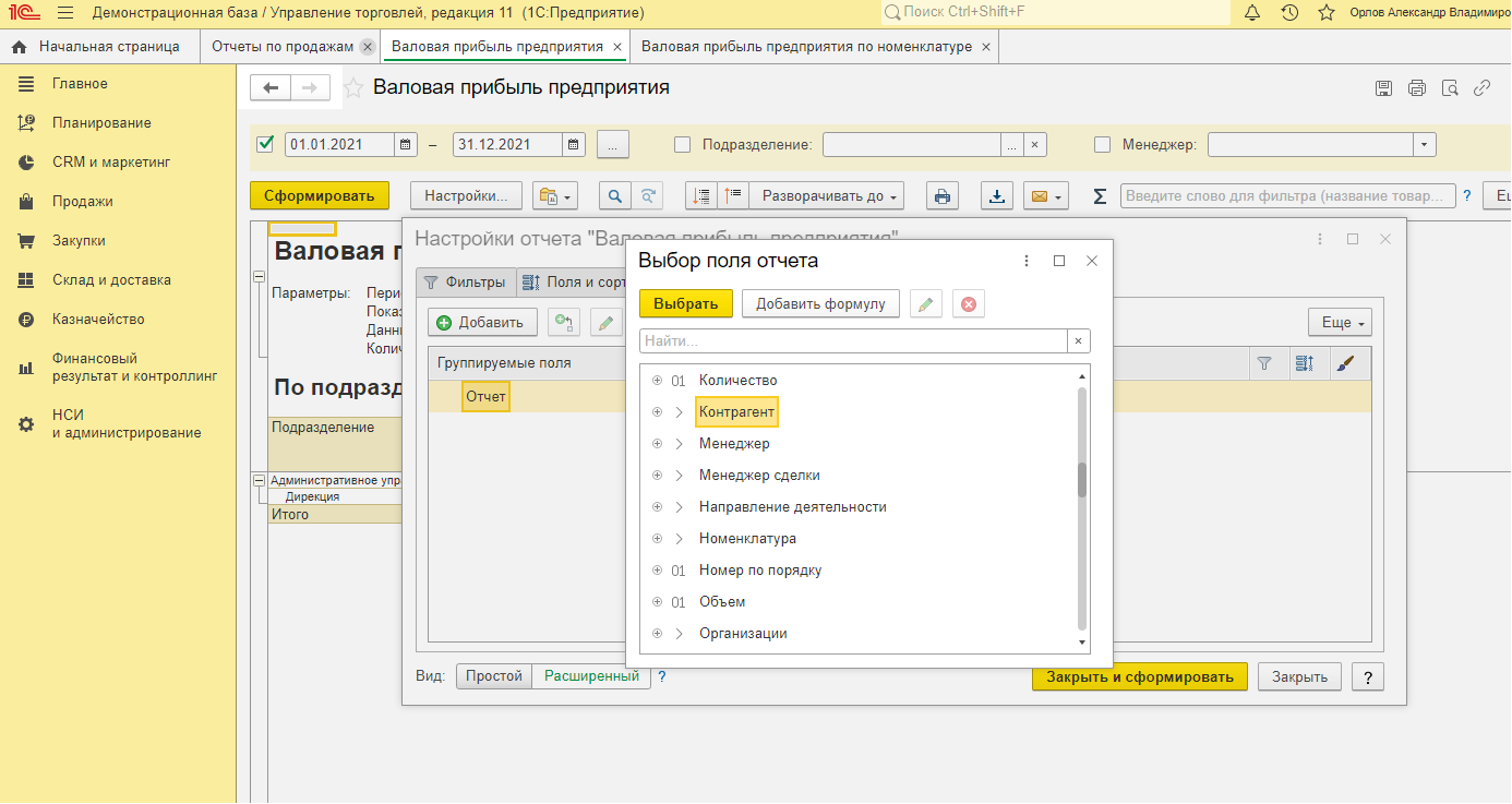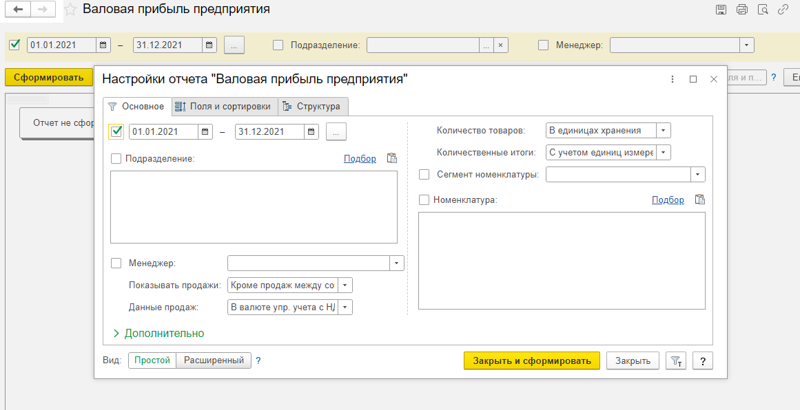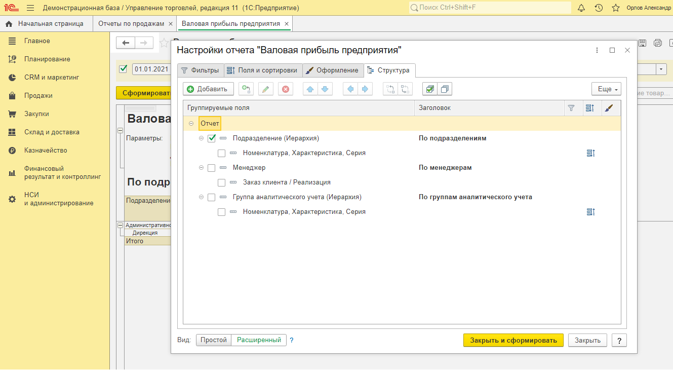 Также можно их открыть из соответствующего раздела по типу отчёта. Настройки каждого отчёта доступны по команде «Настройки», здесь можно выбрать один из вариантов: простой и ра сширенный. Простой вариант предполагает базовые, основные настройки, которые не требуют сохранения и будут применены при каждом последующем формировании отчёта. Расширенный вариант позволяет нам настроить структуру отчёта под себя, добавив нужные поля, отборы и сортировки, с возможностью последующего сохранения варианта отчёта.