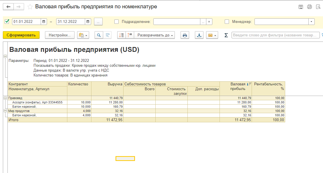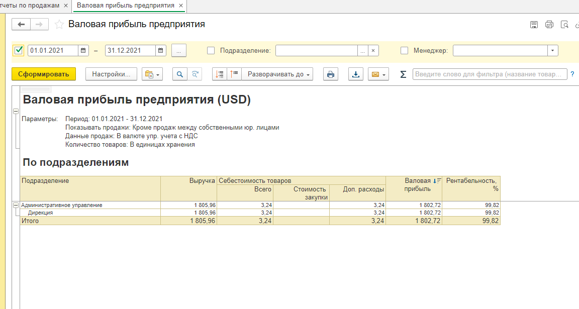 Сначала сформируем отчёт с применением стандартных настроек, сделаем это по кнопке «Закрыть и сформировать». Отчёт сгруппирован по подразделениям, видим показатели выручки, себестоимости, валовой прибыли и рентабельности (рис. 6).