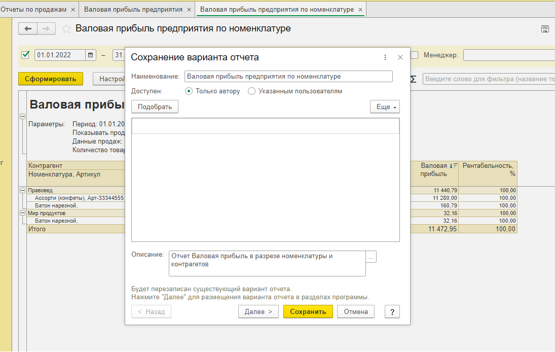Отсюда мы можем формировать, все настройки сохранены. Это очень удобно, не нужно тратить время на настройку отчёта при каждом формировании.