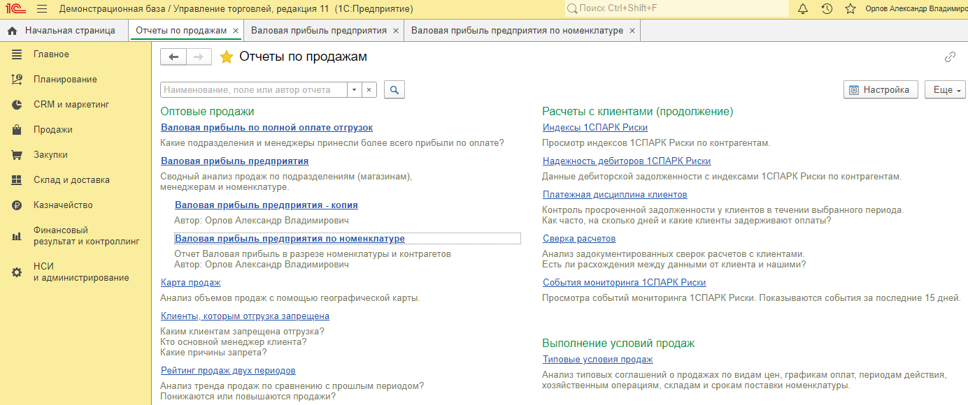 Рассмотрим настройки отчёта «Валовая прибыль предприятия». Этот отчёт является одним из основных, используемых для анализа продаж в разрезе подразделений, менеджеров, номенклатуры. Открыть его можно в разделе «Главное», подменю «Продажи» либо в разделе «Продажи» – «Отчёты по продажам» (рис. 2).