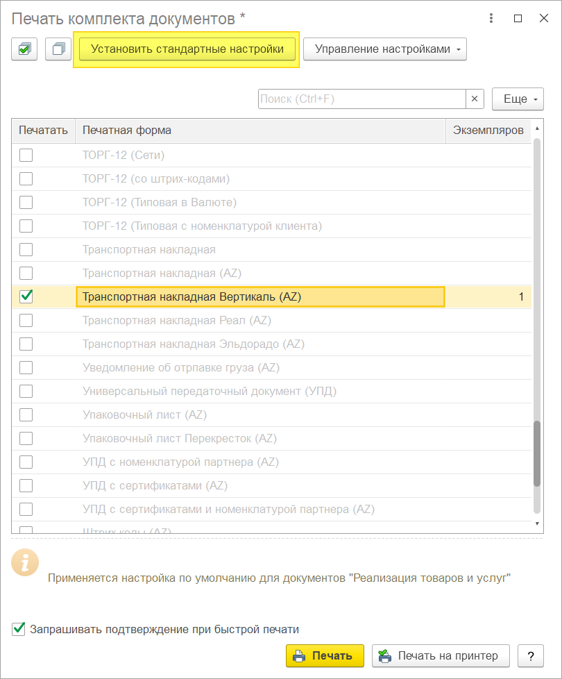 Печатная форма доступна только через печать комплекта документов с настройкой.